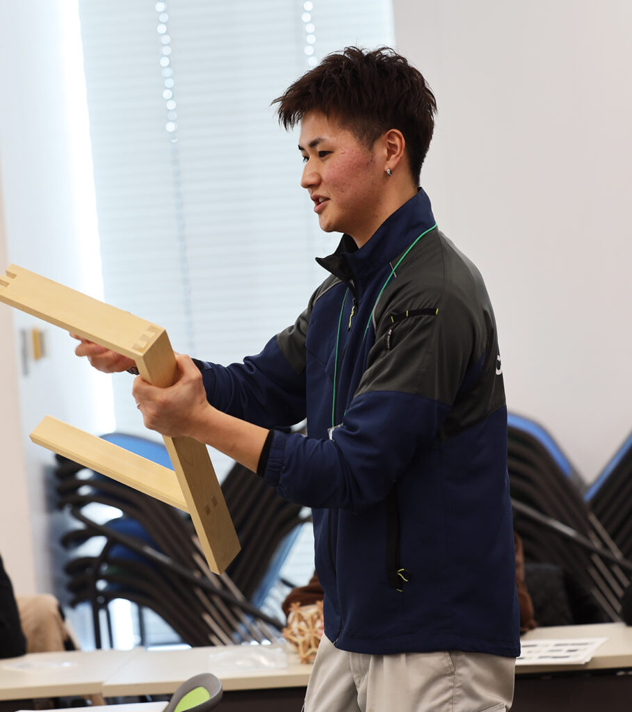 様々な競技職種に即したプログラムが開催される中で、弊社社員の梅田さんが、建具部門でのチャンピオンとして小学生を対象とした「組子細工」の体験プログラムの講師を行いました!